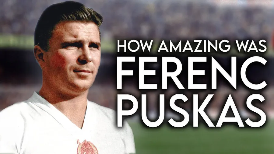 A stunning wallpaper featuring a digitally restored portrait of international football player Ferenc Puskás wearing a white Real Madrid jersey.